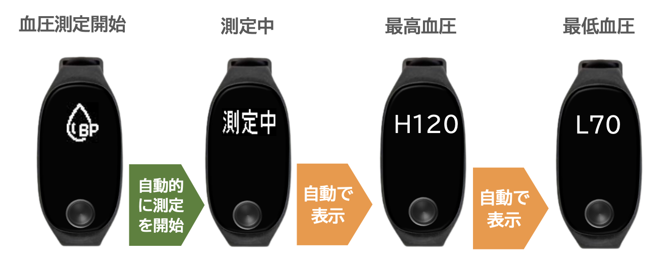 BP(Blood Pressureの略)マークが表示された後、測定が開始され、測定結果(推定値)が表示されます。