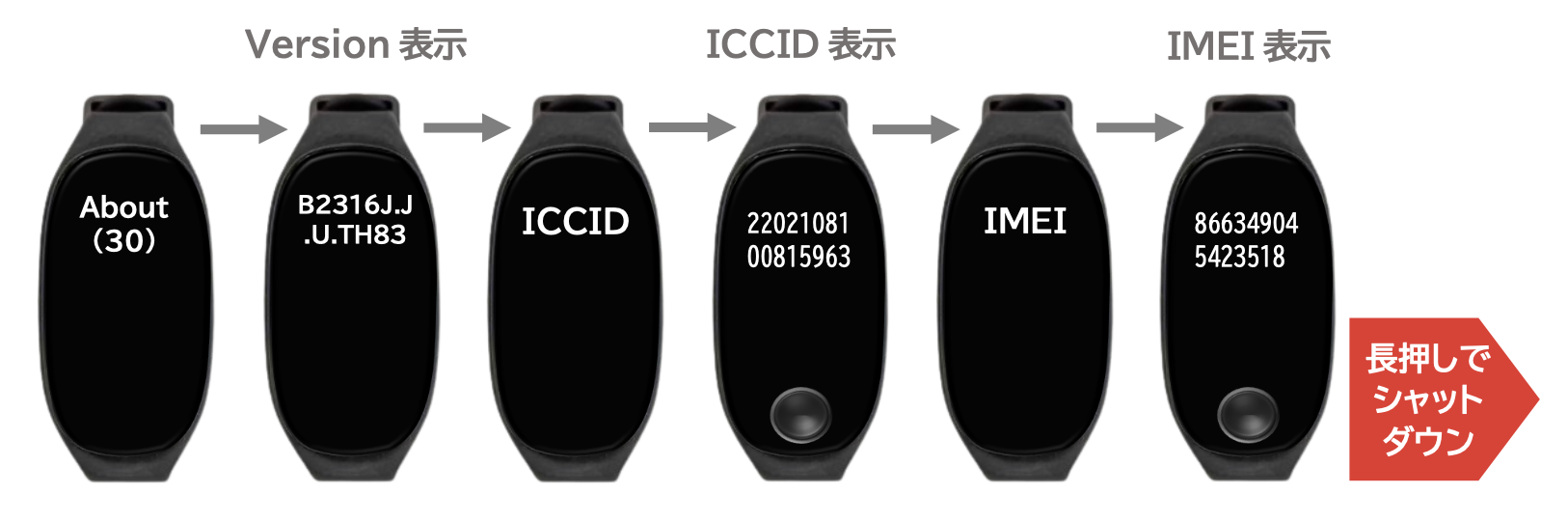 上記の手順で設定表示へ進み、IMEIの数字文字列が表示されるのを待ってから、ボタンを長押しするとシャットダウンされます。その後、再度デバイスの電源をオンにしてください。